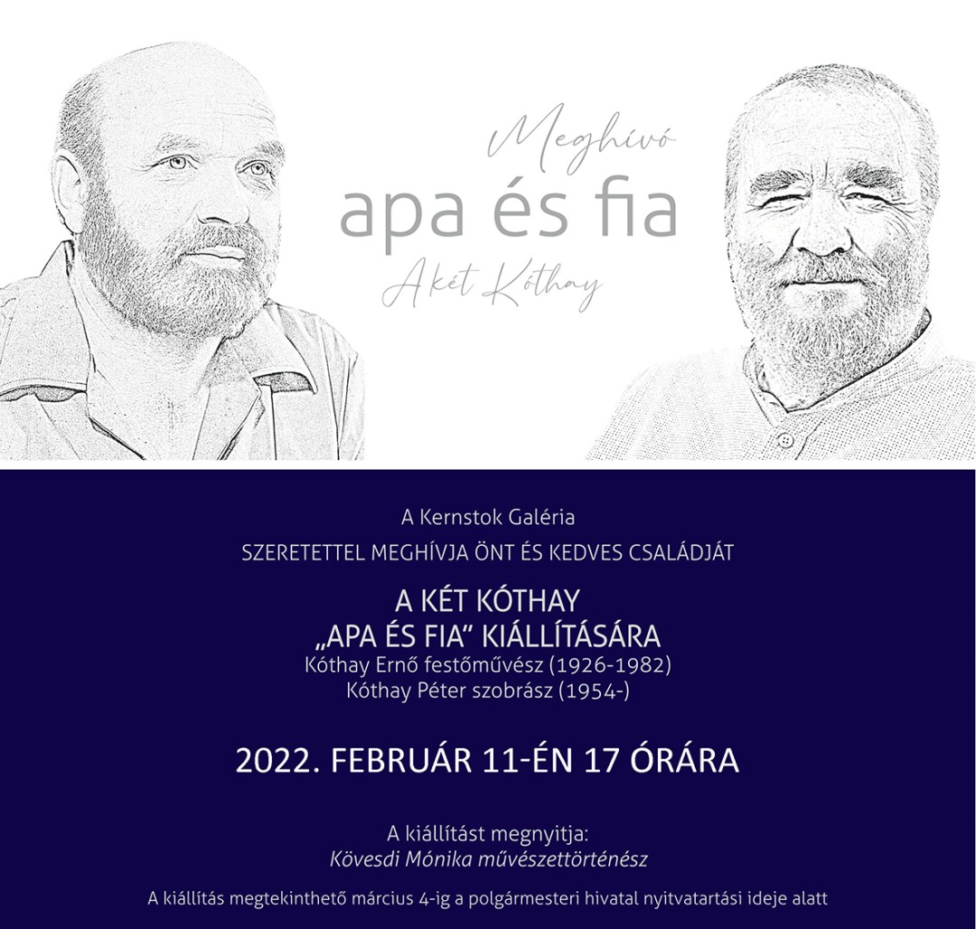 A Kernstok Galéria szeretettel meghívja Önt és kedves családját “A két Kóthay – APA ÉS FIA” kiállításának megnyitójára 2022. február 11-én 17 órára. A kiállítást Kövesdi Mónika művészettörténész nyitja meg. A kiállítás március 4-ig a Városháza nyitva tartási idejében tekinthető meg. /A program ingyenes, helyszíne: Kernstok Galéria (Városháza alagsora) – Nyergesújfalu, Kossuth Lajos u. 104-106. További információ: Kiss Julianna +36-20-254-6116 | A rendezvényt az aktuális járványügyi szabályoknak megfelelően tartjuk meg./