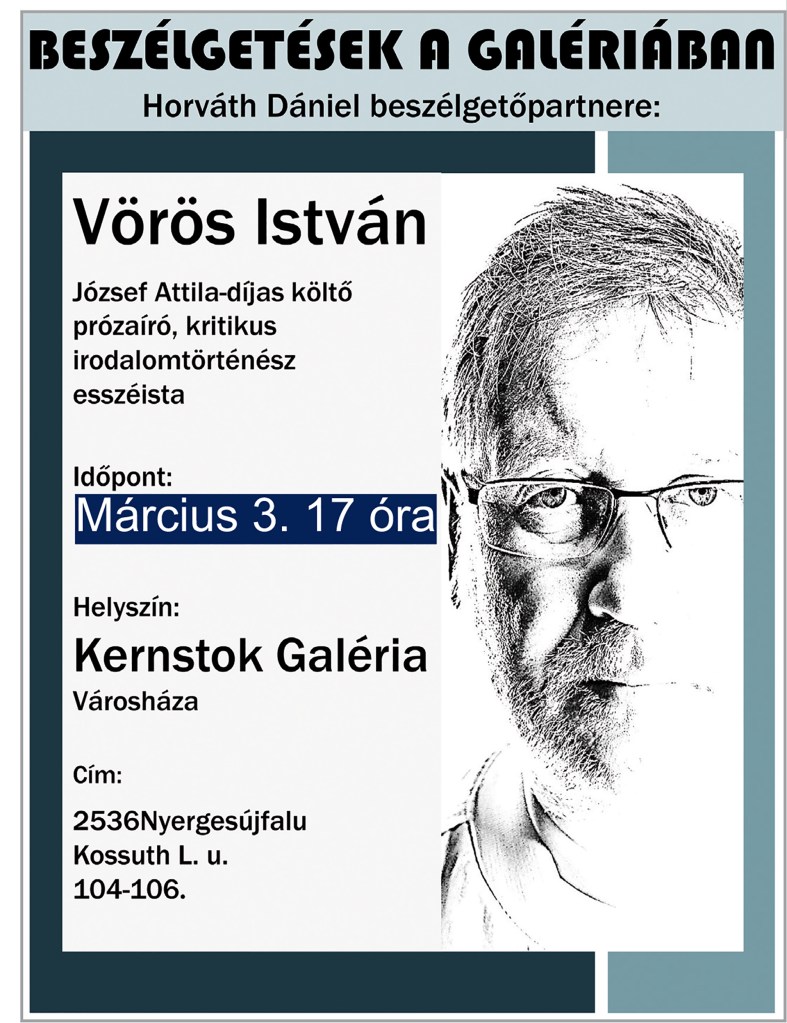 Március 3-án 17:00-kor Vörös István József Attila-díjas költő, prózaíró, kritikus, irodalomtörténész, esszéista lesz Horváth Dániel partnere a Beszélgetések a Galériában sorozatban. /A program ingyenes, helyszíne: Kernstok Galéria (Városháza alagsora) – Nyergesújfalu, Kossuth Lajos u. 104-106. További információ: Kiss Julianna +36-20-254-6116 | A rendezvényt az aktuális járványügyi szabályoknak megfelelően tartjuk meg./