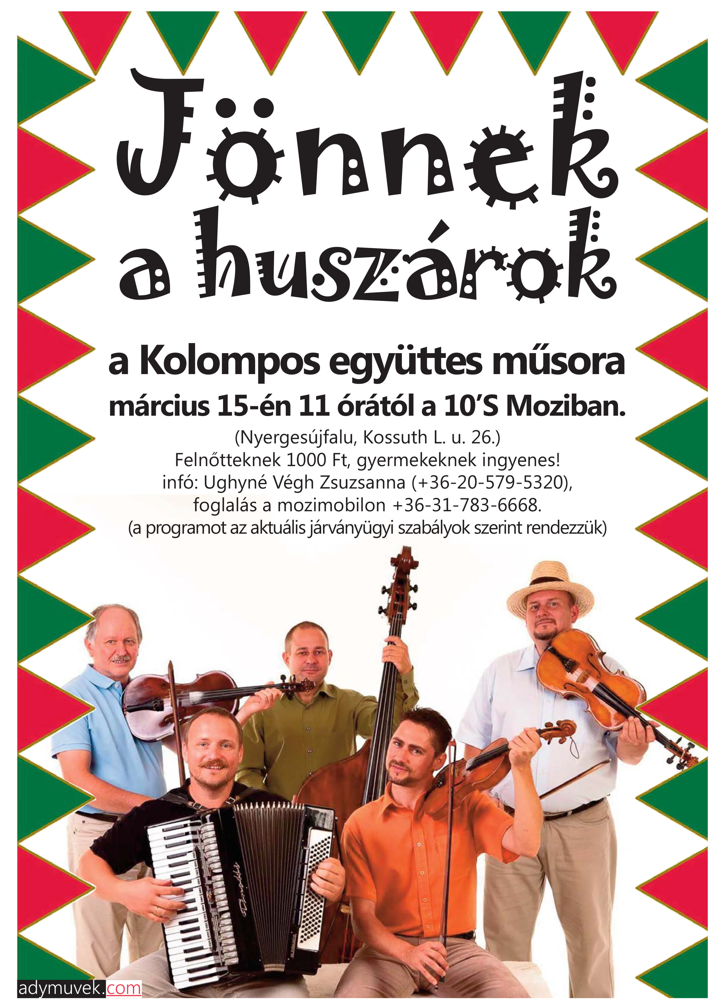Március 15-én 11 órakor a 10’S Moziban (Nyergesújfalu, Kossuth L. u. 26.) a Kolompos együttes bemutatja: JÖNNEK A HUSZÁROK