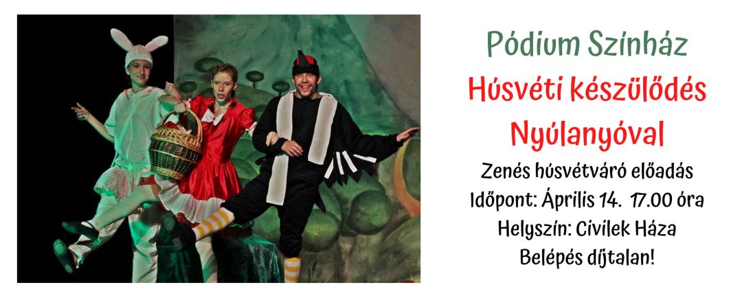 Zenés húsvétváró a Pódium Színház előadásában április 14-én 17:00 órától a Civilek Házában a “Kék Bábszínházban”. A belépés díjtalan, szeretettel várjuk az érdeklődő kicsiket és kicsit nagyobbakat!