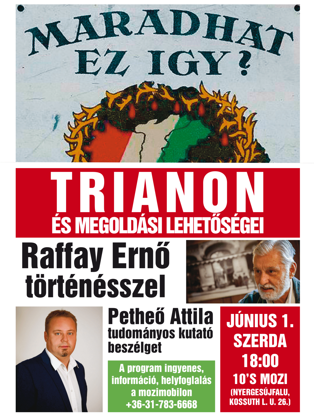 A Nemzeti Összetartozás jegyében, az 1920. június 4-én aláírt békediktátum évfordulójához közeledve minden esztendőben kérdőjelekké válunk, hogyan történhetett? Miért? E sorsfordító eseményünk kérdéseinek hiteles megismerésére – a téma szaktekintélyét, Raffay Ernő történészprofesszort hívtuk meg. Beszélgetőpartnere Petheő Attila tudományos kutató lesz Komáromból, Szlovákiából. Minden kedves érdeklődőt várunk, a program természetesen ingyenes – információ, helyfoglalás a +36-31-783-6668-as mozimobilon.