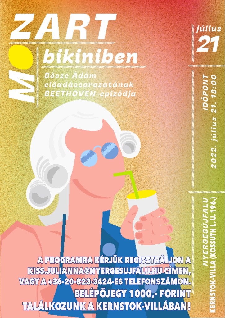 Nyakfodor, hajporköpeny, paszomány, hálósapka. A bécsi klasszika három mestere meglehetősen eltérő nézeteket vallott az öltözködésről. A híresen szeszélyes természetű, többnyire gondozatlan megjelenésű Beethoven nem sokat adott a divatra — mellette Haydn maga volt a nett, mindig tiszta és igényes úr, aki zenészeitől sem fogadta el az udvari uniformis hanyag viseletét. Mozarték pedig szinte megszállottan követték a divat változásait, legyen szó angol, német, vagy francia viseletről. Kordivat és ízlés — ebben a témában kalandozik és igazít el a háromrészes, vetítésekkel és komikus történetekkel, írásos emlékekkel is megtűzdelt előadás.