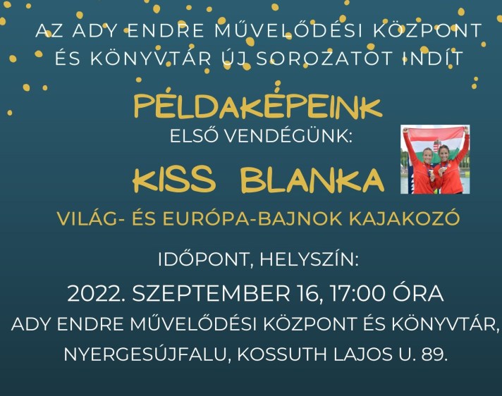 Az Ady Endre Művelődési Központ és Könyvtár új sorozatot indít “Példaképeink” címmel. Első vendégünk: Kiss Blanka Világ-, és Európa-bajnok kajakozó – városunk szülötte. A találkozó időpontja és helyszíne: 2022. szeptember 16-án 17:00-kor a Kossuth Lajos u. 89. alatt (régi iskola épülete). Belépő nincs 🙂 Információ a könyvtárban vagy a +36-20-579-5320-as telefonszámon.